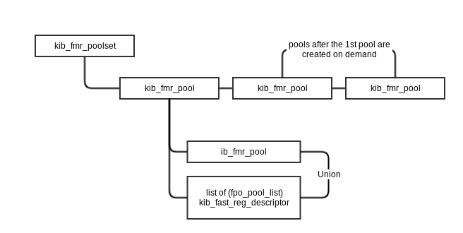 /* When adding a new o2iblnd NET */ kiblnd_startup() /* allocate memory pools per cpt for the network */ kiblnd_net_init_pools() /* * create the memory pools depending on the type of * memory registration available. * memory pools can be added to the list of pools as needed. * new ones added have a life time of 300 seconds. They are * cleaned up if they pass the deadline while idle. * Only the very first pool created on startup remains */ kiblnd_create_fmr_pool() /* * always prefer FMR if supported * fps_pool_size is passed in as a parameter for * the FMR pool allocation */ kiblnd_alloc_fmr_pool() /* * otherwise use Fast Reg * We explicitly allocated fps_pool_size of pools */ kiblnd_alloc_freg_pool() |